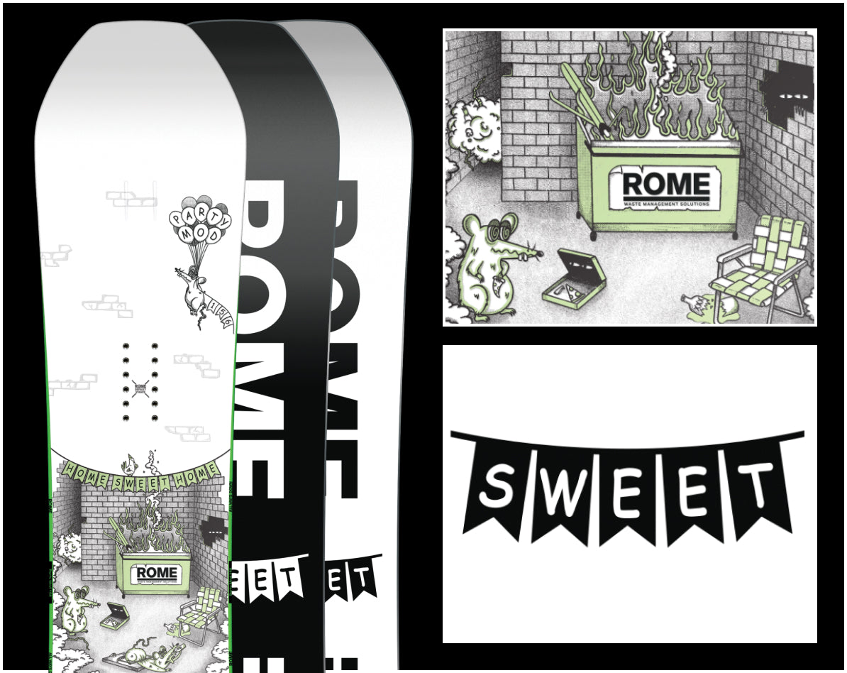 Rome Sweet Rome! This graphic gives you a nice vignette into the gnarliest alleyway hoe-down you’ve never been to. Inspired by The Simpsons, the dumpster behind the Rutland, VT party store, and the debauchery you’ve come to expect from Rome, this board is an all-around good time.